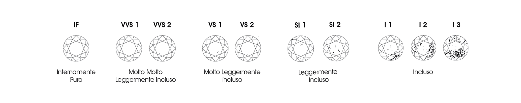 Da IF e SI le inclusioni sono visibili solo ad una lente a 10X mentre per le inclusioni di tipo I sono gia visibili a occhio nudo, questo abbassa notevolmente il pregio del diamante.